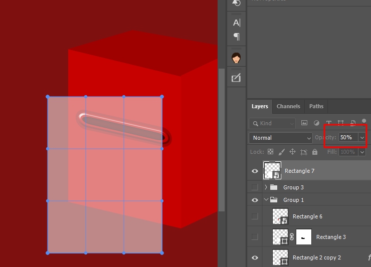 이렇게 활성화가 된 다음 우측 레이어 탭에서 해당 도형 Opacity [ 불투명도 ] 수치를